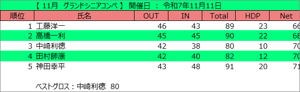 投稿日 : 2025年11月11日 最終更新日時 : 2025年11月11日 投稿者 : 一ツ瀬川 県民ゴルフ場 カテゴリー : グランドシニア月例杯
